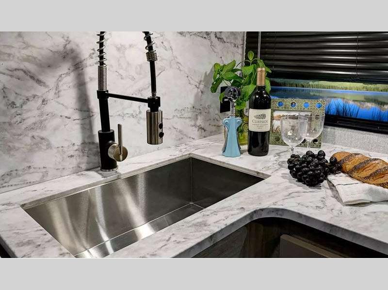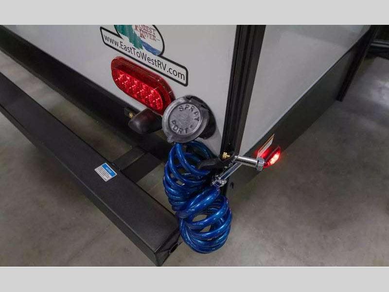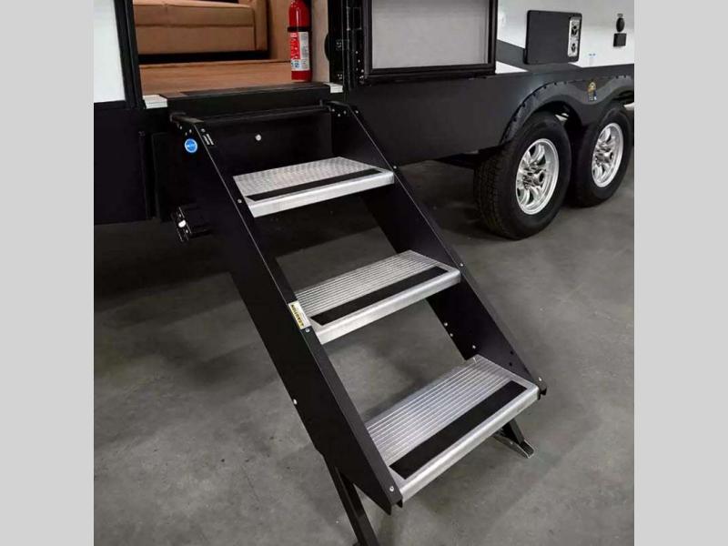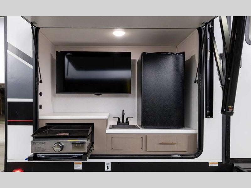 You can make yourself at home with solid pressed membrane countertops, interior LED lights, and black roller shades for added privacy. The outside shower with hot and cold water will let you easily wash off camp gear, and the marine grade exterior speakers will allow you to be the life of the campground. You will also appreciate the universal docking station for easy access to your hookups, plus a high-output on-demand tankless water heater for hot water when you need it.Â