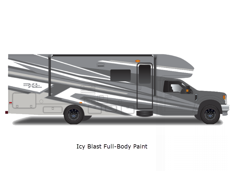 Sleeps 5 Slides 1 Length 31 ft 4 in Ext Width 8 ft 5 in Ext Height 12 ft 6 in Int Height 7 ft Interior Color Stillwater Exterior Color Standard Partial Paint. Full-Body Paint Choices; Harvest Moon, Icy Blast, Summer Solstice, Winter Equinox Hitch Weight 12000 lbs GVWR 19500 lbs Fresh Water Capacity 53 gals Grey Water Capacity 31 gals Black Water Capacity 31 gals Tire Size 225/70R19.5G Furnace BTU 3000 btu Generator Onan 6,000W Fuel Type Diesel Engine 6.7L Power Stroke V8 Turbo Diesel Chassis Ford F550 4x4 Horsepower 330 hp Fuel Capacity 67 gals Wheelbase 212 in Number Of Bunks 1 Available Beds Queen Murphy Torque 950 ft-lb Refrigerator Type 12V Refrigerator Size 10 cu ft Cooktop Burners 3 Shower Size 30" x 36" Number of Awnings 1 LP Tank Capacity 24 lbs Water Heater Capacity 10 gal Water Heater Type Gas/Electric AC BTU 15000 btu TV Info LR LED 50" HD Smart TV, Ext. LED HD Smart TV Awning Info 19' Electric with LED Lights Gross Combined Weight 31500 lbs Shower Type Standard Electrical Service 50 amp Similar Floorplans