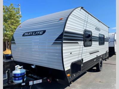 The perfect couple's trailer is waiting for you with this Sun Lite LTD! The front RV queen bed will provide a great night's rest after a day of hiking outdoors, and the full rear bath will let you clean up each day. There is a booth dinette where you can dine at each day, and even let another guest sleep over if needed. You'll also find a two burner stove to make meals, a double sink to clean up, and a 4.3 cu. ft. 12V refrigerator for leftovers! What's not to love about this travel trailer?!