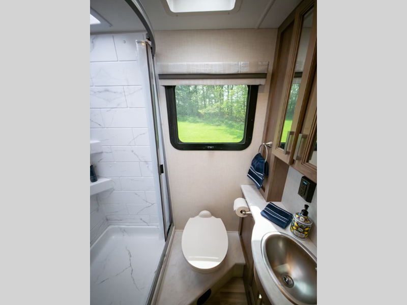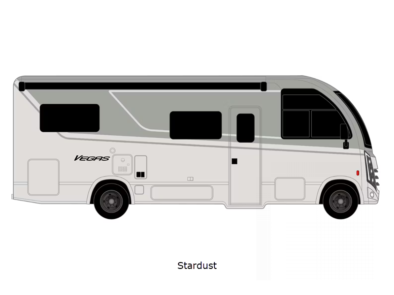 The 14" touchscreen dash radio in the cab comes with Bluetooth, Android Auto, and Apple CarPlay, and it is ready for SiriusXM radio. The reclining/swivel leatherette captain's chairs are super comfortable, and they can even serve as an additional lounge spot for the rest of the living area when you swivel them around. The Vegas kitchen is ready to help you make meals on the go, and you will find the 12V double-door refrigerator, two-burner gas cooktop, and convection microwave to be quite useful. You will also appreciate the durable premium one-piece domed roof membrane, the 15,000 BTU A/C, and the tankless water heater for endless hot water when you need it.